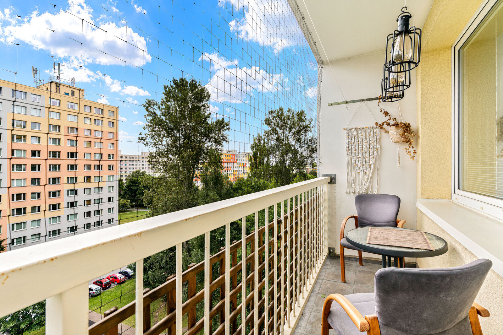 Byt je dispozičně řešený jako 3+1 s podlahovou plochou 72,6 m². Jeho součástí je také lodžie (5,7 m²), komora na patře (1 m²) , sklepní kóje (1 m²) a další úložné prostory v uzamykatelné vestavné skříni na chodbě před bytem. Byt se nachází v 7. patře dvanáctipatrového panelového domu.