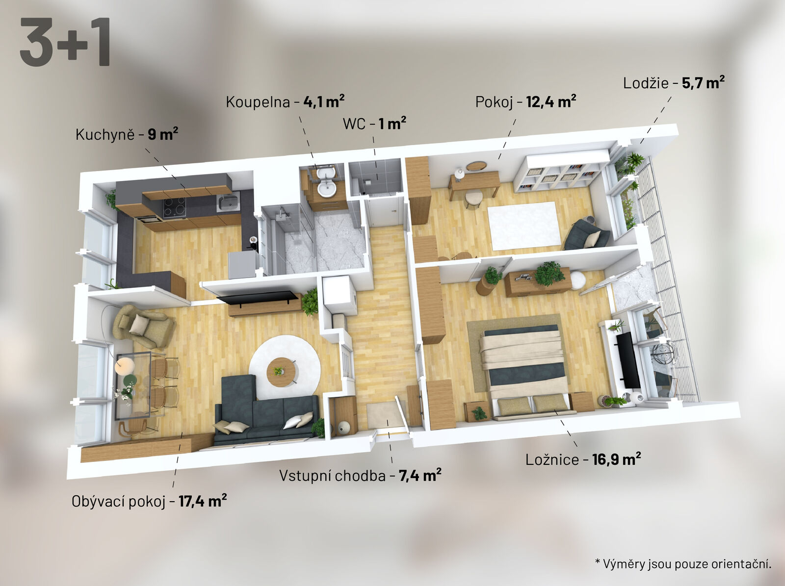 Orientace bytu je V/Z, kdy obývací pokoj a kuchyně je na stranu západní a pokoje s lodžií jsou situovány na východ.